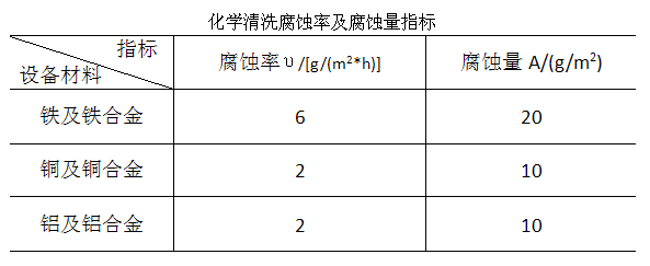 化學清洗時金屬腐蝕率和腐蝕量應(yīng)不大于下表指標。